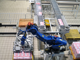 1機器人碼垛機的介紹 機器人碼垛機是機、電一體化高新技術(shù)產(chǎn)品。中、低位碼垛機可以滿足中低產(chǎn)量的生產(chǎn)需要。可按照要求的編組方式和層數(shù),完成對料袋、膠塊、箱體等各種產(chǎn)品的碼垛。 最優(yōu)化的設計使得垛形緊密、整齊。 2結(jié)構(gòu)特點: 中、低位碼垛機主要由壓平輸送機、緩停輸送機、轉(zhuǎn)位輸送機、托盤倉、托盤輸送機、編組機、推袋裝置、碼垛裝置、垛盤輸送機組成。其結(jié)構(gòu)設計優(yōu)化,動作平穩(wěn)可靠。碼垛過程完全自動,正常運轉(zhuǎn)時無須人工干預,具有廣泛的適用范圍。 3控制系統(tǒng)特點: 主要控制元件,包括可編程控制器、變頻調(diào)速控制器、接近開關(guān),按鈕開關(guān)和接線端子等均采用品質(zhì)一流的產(chǎn)品,確保了系統(tǒng)硬件的可靠性和長壽命。高品質(zhì)的硬件和由專家設計的專門控制軟件相結(jié)合,實現(xiàn)了系統(tǒng)高度的自動化。完善的安全聯(lián)鎖機制,可以對設備和操作人員提供保護。圖形顯示觸摸屏使碼垛機操作簡單,故障診斷容易,同時方便了檢修和維護。 4機器人碼垛機的分類 堆碼機,碼垛機,自動堆碼機,自動碼垛機,碼垛機器人,機器人 平板上工件符合棧板要求的一層工件,平板及工件向前移動直至棧板垂直面。上方擋料桿下降,另三方定位擋桿起動夾緊,此時平板復位。各工件下降到棧板平面,棧板平面與平板底面相距10mm,棧板下降一個工件高度。往復上述直到棧板堆碼達到設定要求。 |