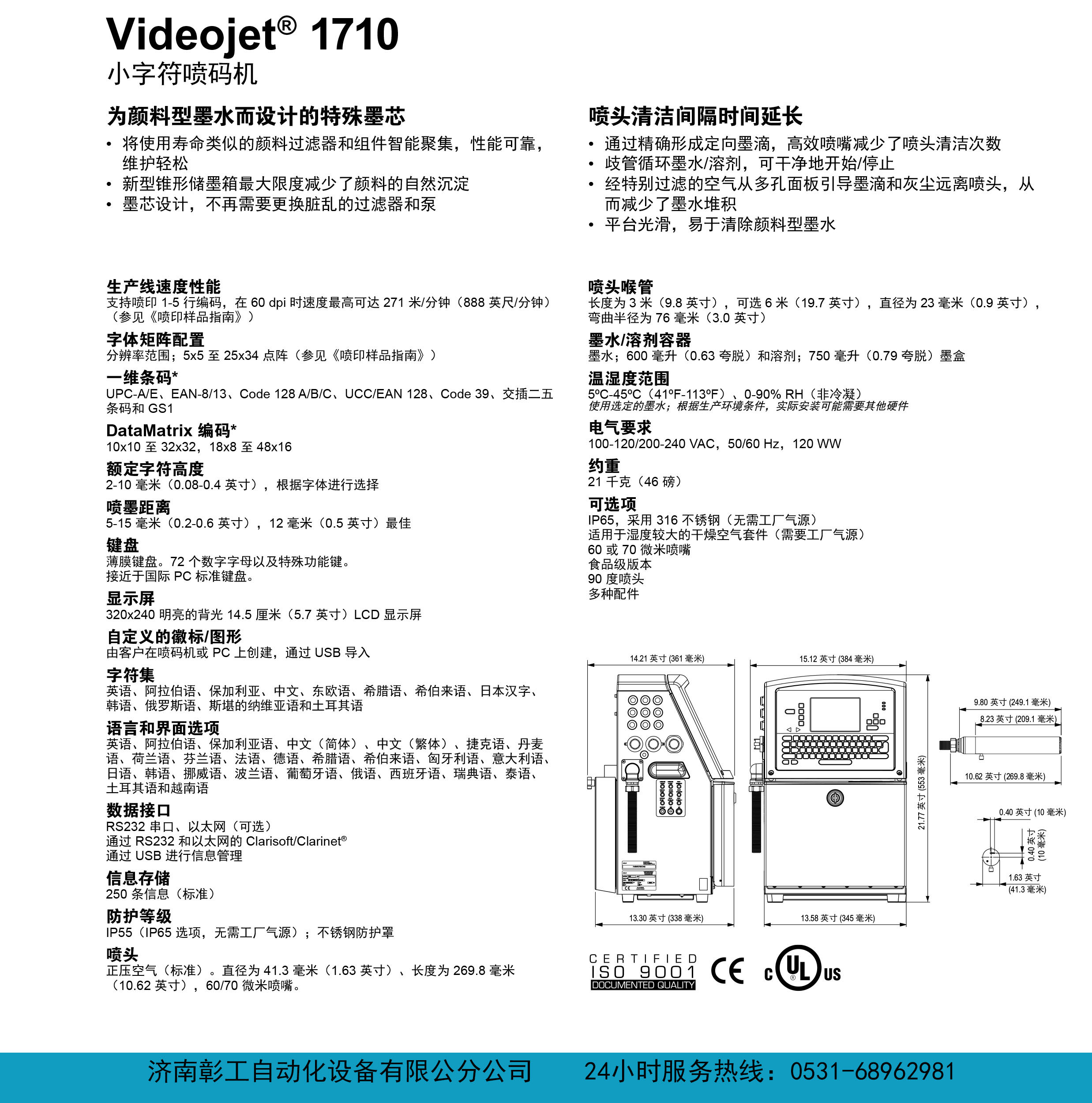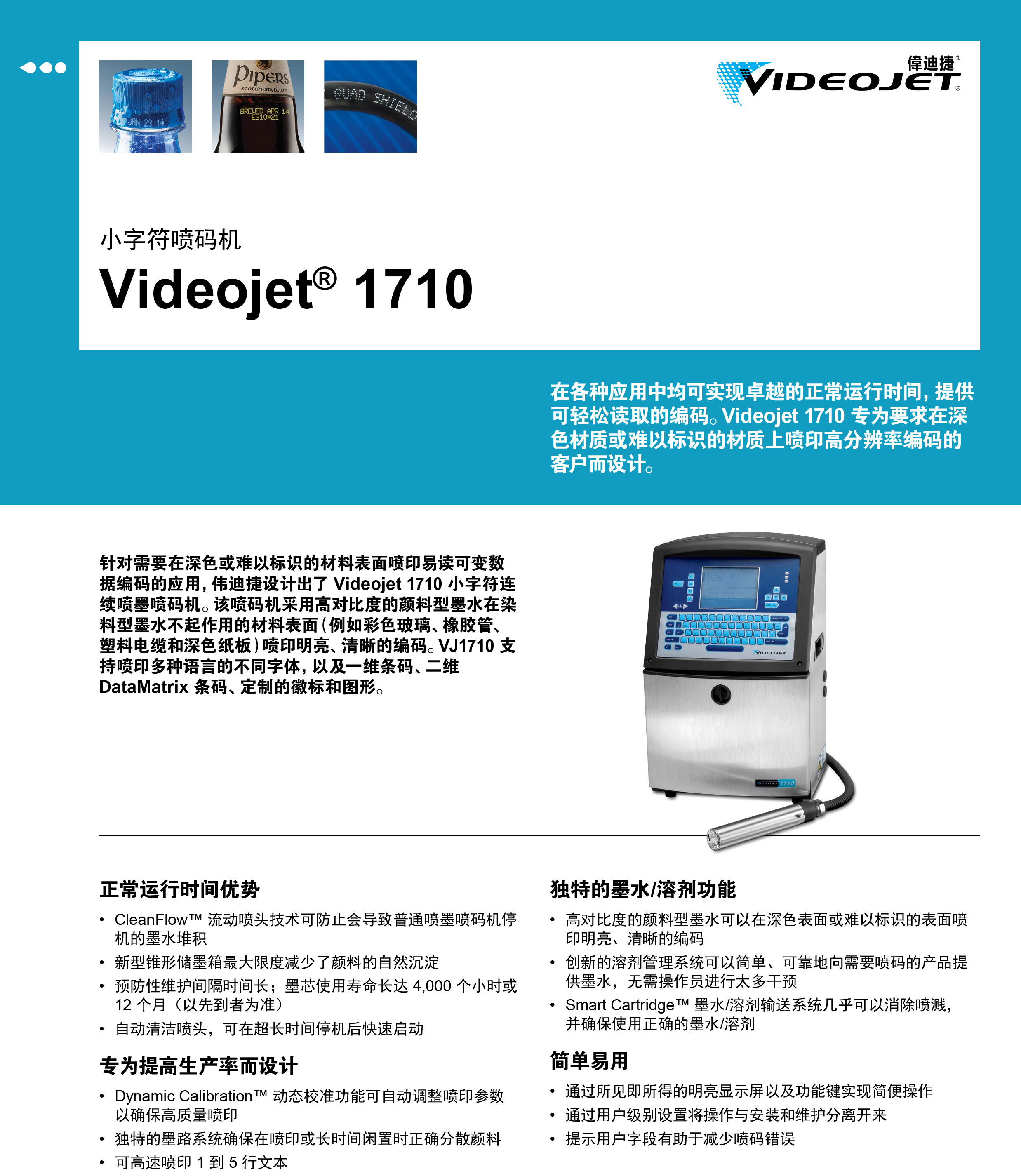 白色墨水在深色材質(zhì)上標(biāo)識更加出色,醒目 針對需要在深色或難以標(biāo)識的材料表面噴印易讀可變數(shù)據(jù)編碼的應(yīng)用,偉迪捷設(shè)計出了 Videojet 1710 白墨噴碼機。該顏料型噴碼機采用高對比度的顏料型墨水在染料型墨水不起作用的材料表面(例如彩色玻璃、橡膠管、塑料電纜和深色紙板)噴印明亮、清晰的編碼。它可以噴印多種語言的不同字體,也可以噴印一維條碼、二維 DataMatrix 編碼、定制的徽標(biāo)和圖形。 能夠滿足快速生產(chǎn)線的需求: Dynamic Calibration™(動態(tài)校準(zhǔn)功能)可自動調(diào)整噴射參數(shù)以確保高質(zhì)量噴印 獨特的溶劑系統(tǒng)確保在噴印或長時間閑置時正確分散顏料 可高速噴印 1 到 5 行文本: 單行最大速度 = 271 米/分鐘(888 英尺/分鐘) 雙行最大速度 = 122 米/分鐘(400 英尺/分鐘) 三行最大速度 = 67 米/分鐘(221 英尺/分鐘) 專為超長運行時間而設(shè)計,通過以下方式獲得正常運行時間優(yōu)勢: 采用 CleanFlow™ 清潔流動技術(shù)的打印頭,可防止會導(dǎo)致普通噴墨噴碼機停機的墨水堆積 新型錐形儲墨箱最大限度減少了顏料沉淀的自然效果 預(yù)防性維護期間的運行時間長;墨芯使用壽命4000小時或者12個月(以先到者為準(zhǔn)) 內(nèi)部氣泵中沒有外部空氣,可降低污染物進(jìn)入墨滴流的潛在風(fēng)險 自動清潔打印頭,可在超長時間停機后快速啟動 墨水和溶劑輸送無臟亂、無浪費: 創(chuàng)新的溶劑管理系統(tǒng)可以簡單、可靠地向需要噴碼的產(chǎn)品提供墨水,無需操作員進(jìn)行太多干預(yù) Smart Cartridge™(智能墨盒)墨水和溶劑輸送系統(tǒng)幾乎可以消除噴濺,并確保使用正確的墨水和溶劑 通過偉迪捷標(biāo)準(zhǔn) CIJ 界面實現(xiàn)簡單適用性: 通過所見即所得功能以及功能鍵的明亮顯示實現(xiàn)簡便操作 通過用戶級別將操作從安裝和維護中分開 提示的用戶字段有助于減少噴碼錯誤 |