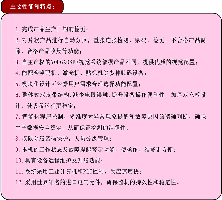 日期檢測功能特點詳解: 通過字符識別技術(shù)(OCR)檢測產(chǎn)品上的三期信息是否合格。 可檢測漏打碼、字符殘缺、模糊、重碼、偏移、內(nèi)容錯誤等噴碼缺陷。 支持激光打碼、墨水噴碼、碳帶打印等多種打碼方式的檢測應(yīng)用。 安裝在客戶生產(chǎn)線上,在線檢測。并自動剔除不合格產(chǎn)品。 可存儲多組檢測參數(shù),換產(chǎn)時可直接調(diào)用,可快速完成切換產(chǎn)品操作。 該檢測系統(tǒng)廣泛應(yīng)用在醫(yī)藥、食品、日化、化工等行業(yè)。包括標(biāo)簽打碼、外箱噴碼、瓶子噴碼等標(biāo)識的檢測。對每個產(chǎn)品打碼的效果進(jìn)行檢驗,有效的避免消費(fèi)者對貴司產(chǎn)品品牌形象的不良影響。 拓展應(yīng)用: 支持日期內(nèi)容自動同步系統(tǒng)時間功能。減少人工設(shè)置操作。 支持與客戶系統(tǒng)對接。從客戶服務(wù)器獲取對比數(shù)據(jù)。從而自動設(shè)置檢測參數(shù)。無需人工干預(yù)。 支持噴碼背景有多種顏色的應(yīng)用場合。可選用彩色光源。保證圖像拍照效果最佳。切換相機(jī)方案時,光源顏色同時自動切換。 |