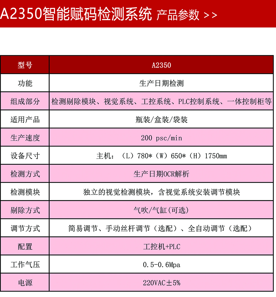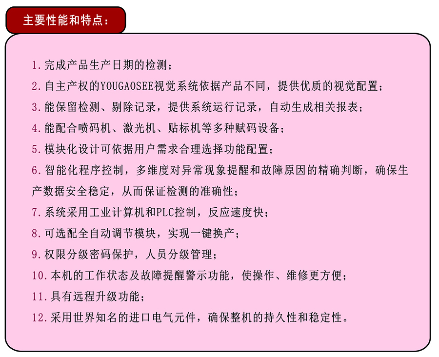 日期檢測功能特點詳解: 通過字符識別技術(shù)(OCR)檢測產(chǎn)品上的三期信息是否合格。 可檢測漏打碼、字符殘缺、模糊、重碼、偏移、內(nèi)容錯誤等噴碼缺陷。 支持激光打碼、墨水噴碼、碳帶打印等多種打碼方式的檢測應(yīng)用。 安裝在客戶生產(chǎn)線上,在線檢測。并自動剔除不合格產(chǎn)品。 可存儲多組檢測參數(shù),換產(chǎn)時可直接調(diào)用,可快速完成切換產(chǎn)品操作。 該檢測系統(tǒng)廣泛應(yīng)用在醫(yī)藥、食品、日化、化工等行業(yè)。包括標(biāo)簽打碼、外箱噴碼、瓶子噴碼等標(biāo)識的檢測。對每個產(chǎn)品打碼的效果進行檢驗,有效的避免消費者對貴司產(chǎn)品品牌形象的不良影響。 拓展應(yīng)用: 支持日期內(nèi)容自動同步系統(tǒng)時間功能。減少人工設(shè)置操作。 支持與客戶系統(tǒng)對接。從客戶服務(wù)器獲取對比數(shù)據(jù)。從而自動設(shè)置檢測參數(shù)。無需人工干預(yù)。 支持噴碼背景有多種顏色的應(yīng)用場合?蛇x用彩色光源。保證圖像拍照效果最佳。切換相機方案時,光源顏色同時自動切換。 |